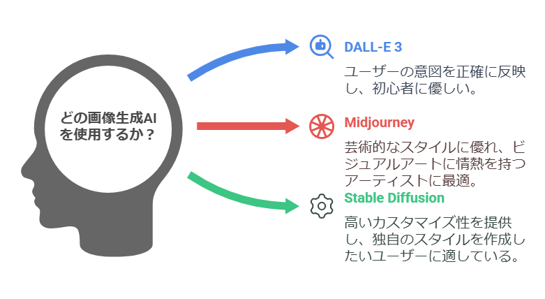 他の画像生成AI(例えばMidjourneyやStable Diffusion)と比較すると、DALL-E 3は特にテキストと画像の統合が強みです。特に、DALL-E 3はプロンプトの解釈能力が優れており、複雑な指示にも対応しやすいのが特徴です。Midjourneyは芸術的なスタイルに強く、Stable Diffusionはカスタマイズ性が高いですが、DALL-E 3は「説明文から直感的に画像を生成する能力」に優れ、初心者でも扱いやすいのが特徴です。