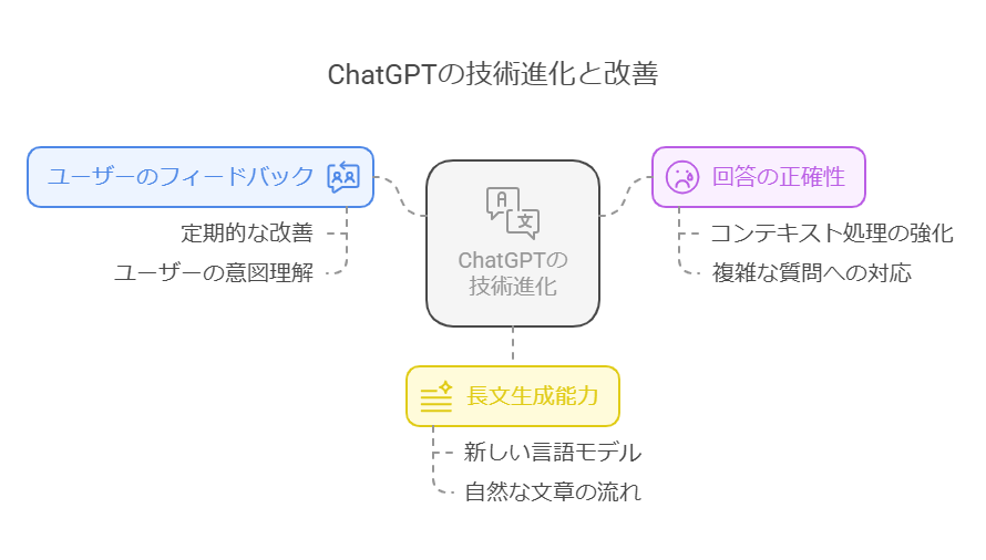 ChatGPTの技術は常に進化しており、ユーザーのフィードバックをもとに定期的な改善が行われています。最近では、回答の正確性向上や、長文の生成能力の強化が進められています。例えば、最新のアップデートでは、より自然な文章の流れを作るための新しい言語モデルの改良が行われました。また、ユーザーの意図をより正確に理解するためのコンテキスト処理の強化も実施され、複雑な質問に対してより適切な回答が得られるようになっています。
